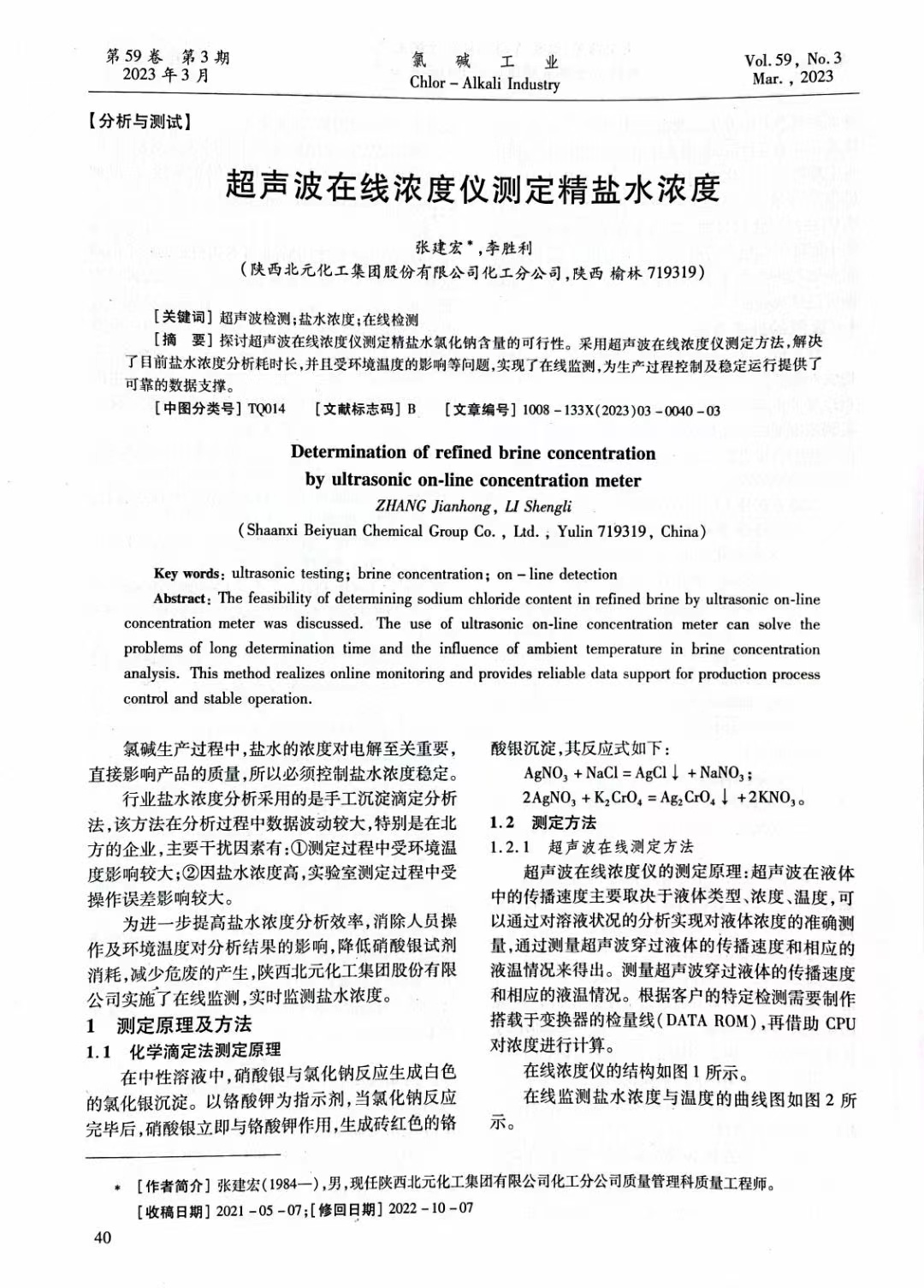 news center我司客戶(hù)陜西北元化工集團(tuán)有限公司化工分公司質(zhì)量管理科質(zhì)量工程師-張建宏在氯堿工業(yè)期刊中發(fā)表論文。詳細(xì)剖析超聲波在線濃度儀測(cè)定精鹽水氯化鈉含量的可行性。采用超聲波在線濃度儀進(jìn)行在線分析后,為生產(chǎn)提供實(shí)時(shí)準(zhǔn)確的數(shù)據(jù)分析,便于生產(chǎn)工藝及時(shí)調(diào)控和生產(chǎn)過(guò)程的穩(wěn)定運(yùn)行。以下為論文內(nèi)容: